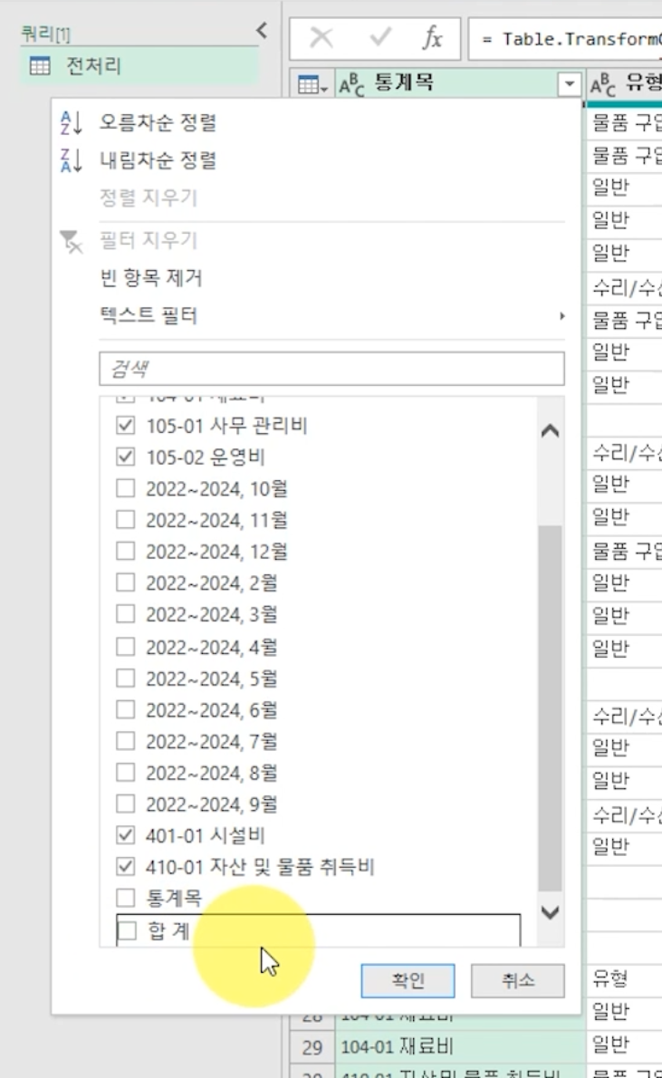'통계목' 필드의 필터 버튼을 눌러 '(Null)'에 체크를 해제하고 '연도'와 '월'을 표시하는 부분의 항목도 체크 표시를 없앱니다. 그리고 맨 아래쪽 '통계목'과 '합계'도 체크를 해제합니다.