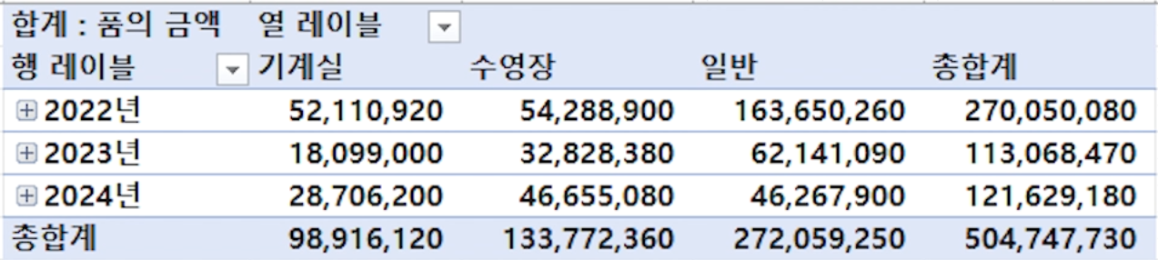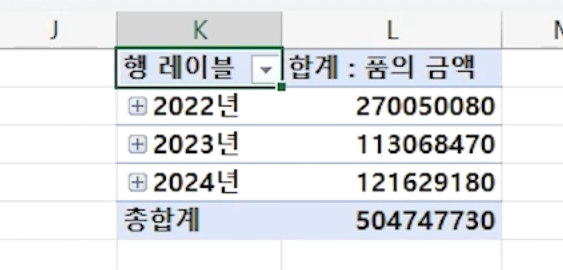 각 연도에서 마우스 오른쪽 버튼을 눌러 [전체 필드 확장]을 누르면 연도별, 분기별 품의 금액의 합계를 단계별로 확인할 수 있습니다.
