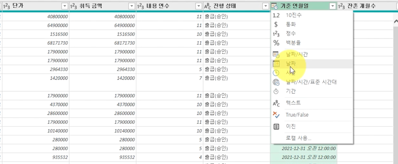 그리고 '수량'에서 '취득 금액'은 형식이 [정수]가 맞아 그대로 두고 그리고 오른쪽으로 스크롤을 해 '기준 연월일'을 [날짜]로 변경합니다.