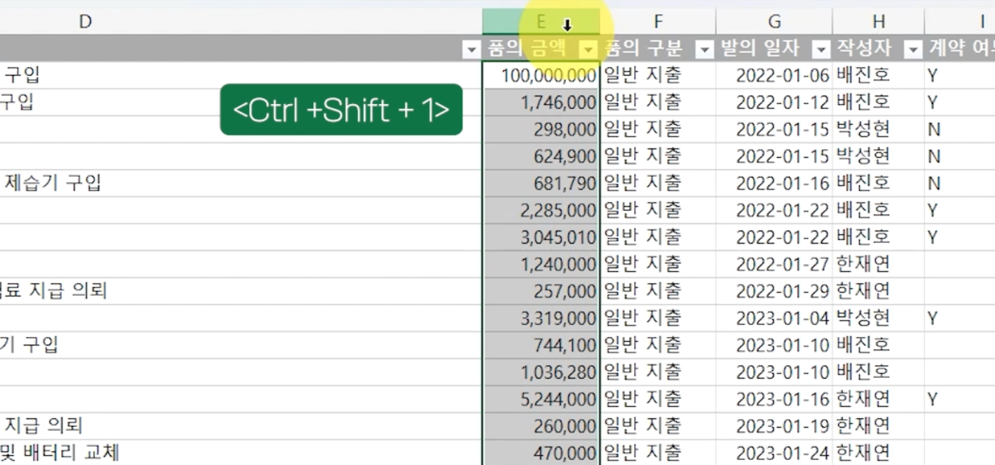 품의 금액은 단위를 읽기 쉽도록 범위 지정하고 <Ctrl + Shift + 1>을 누르면 천 단위 구분 기호가 표시됩니다.