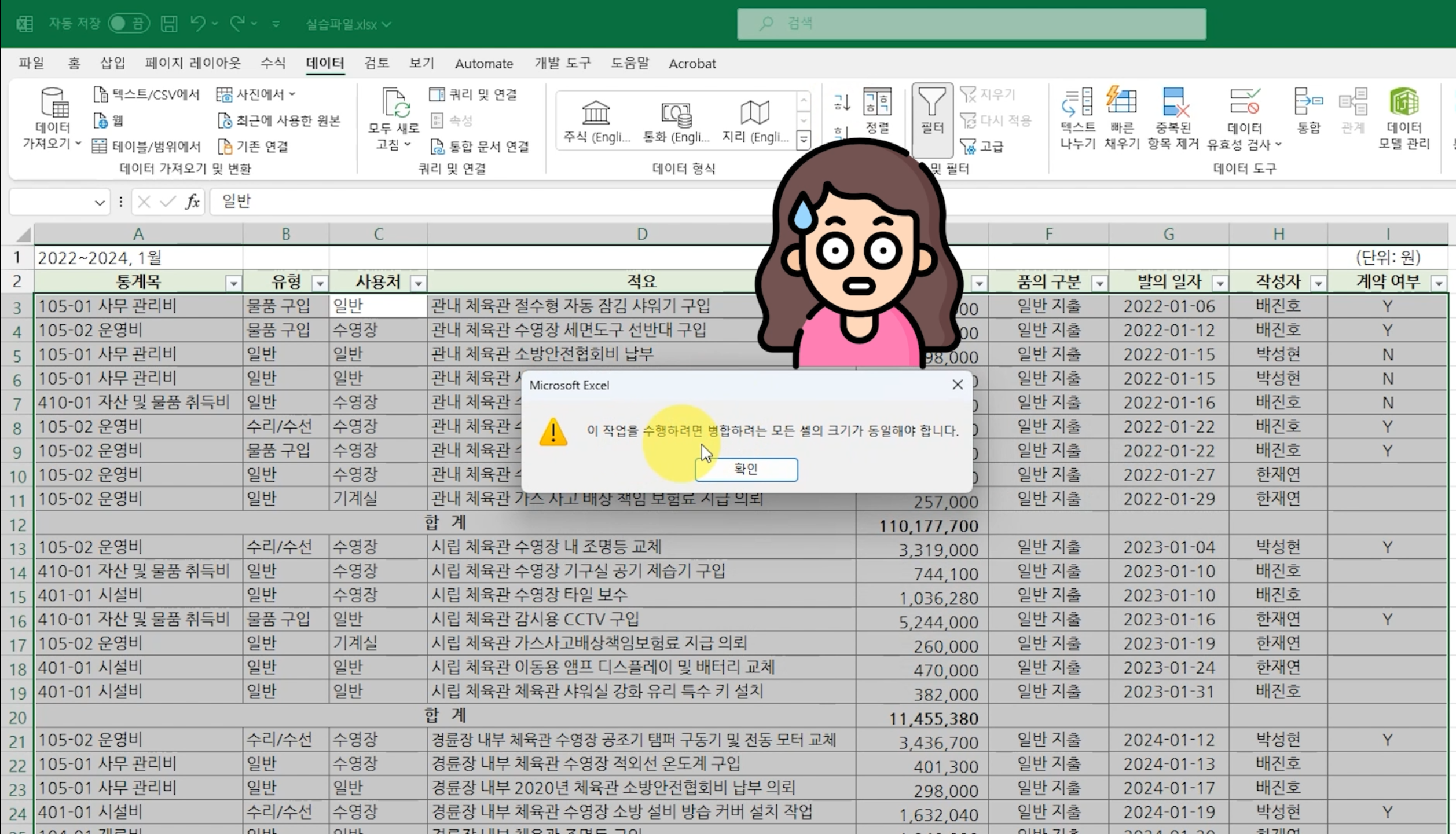 이유는 데이터 내부에 합계를 구한 행이 병합되어 있기 때문입니다. 이렇게 데이터 중간에 병합된 셀이 있으면 정렬을 할 수 없습니다.