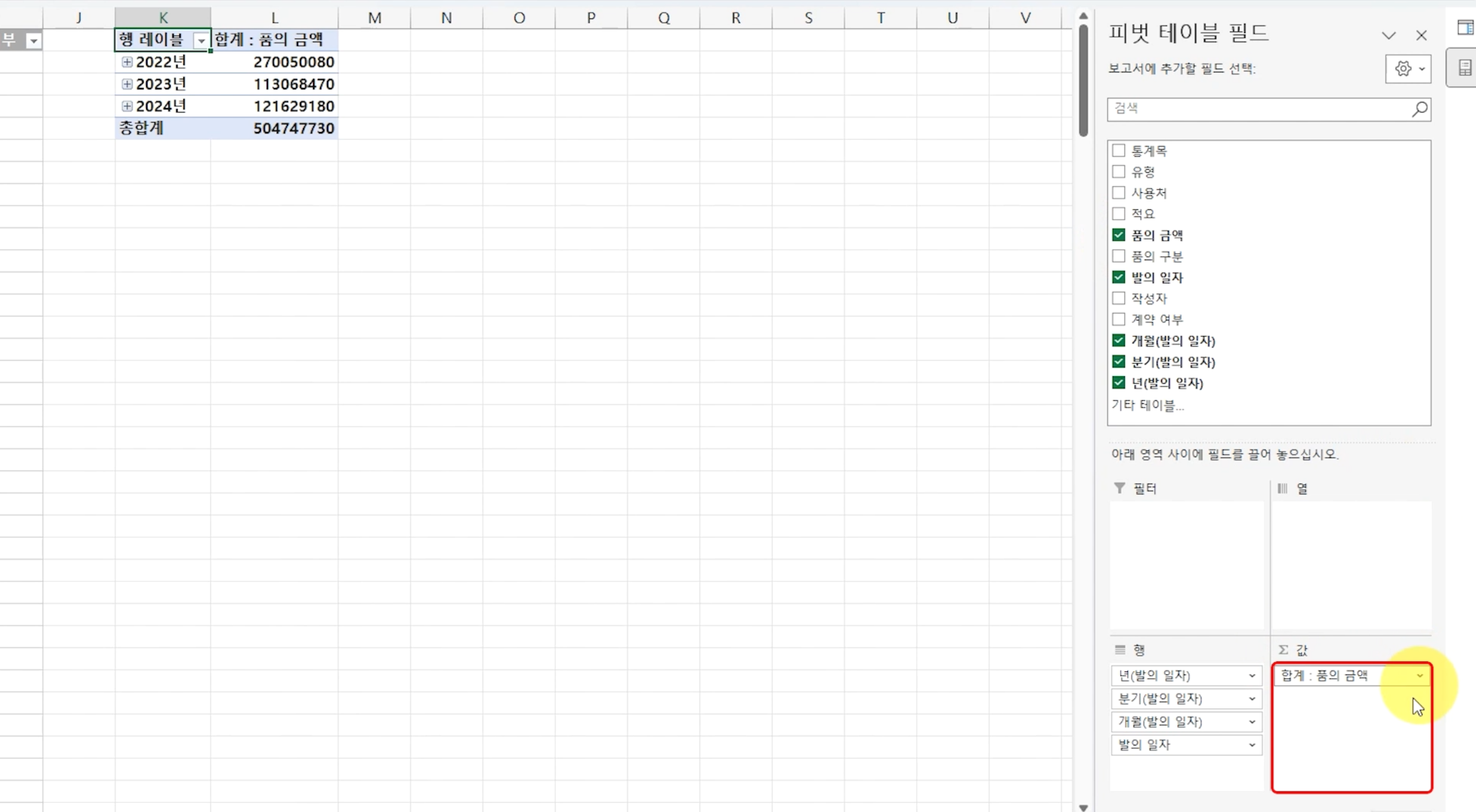 그리고 품의 금액의 합계를 표시할 것이므로 '품의 금액'에 체크 표시합니다. 그러면 값 영역에 필드가 추가됩니다.