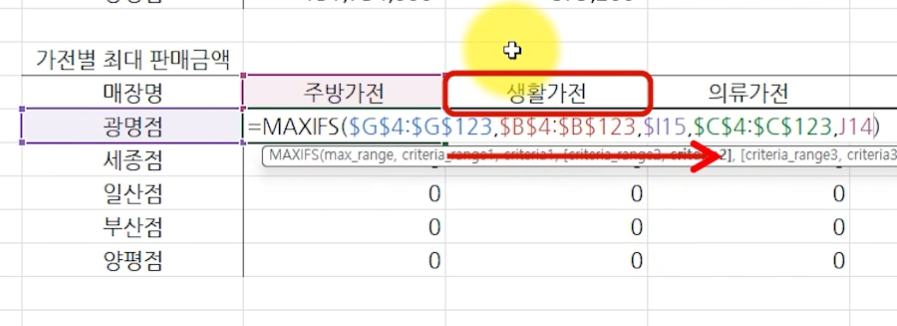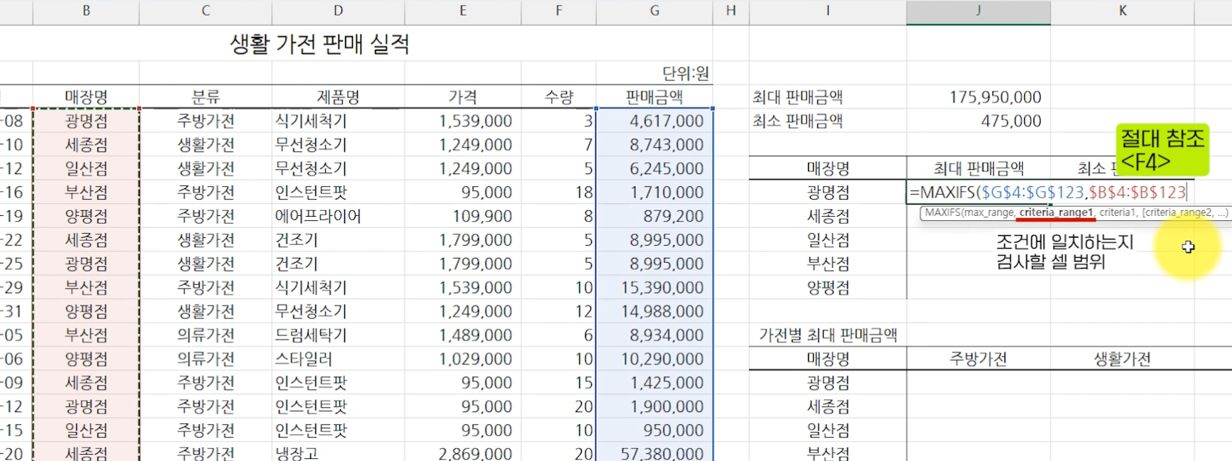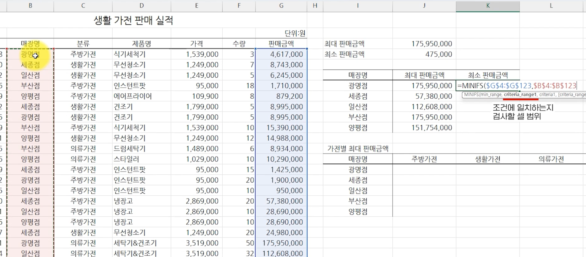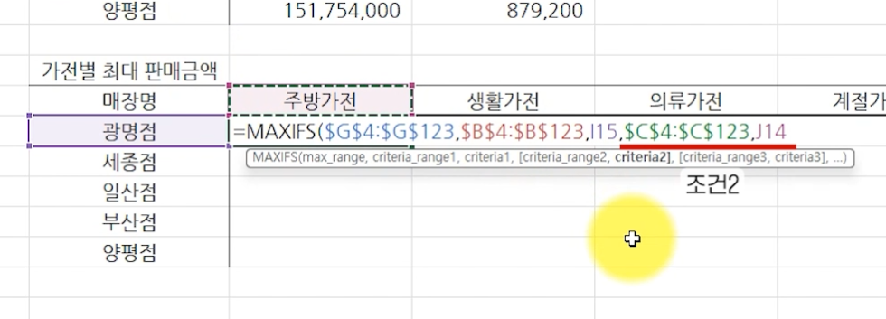 먼저 criteria_range2 인수로 가전 판매 실적에서 분류 범위를 지정하고 절대 참조합니다.
