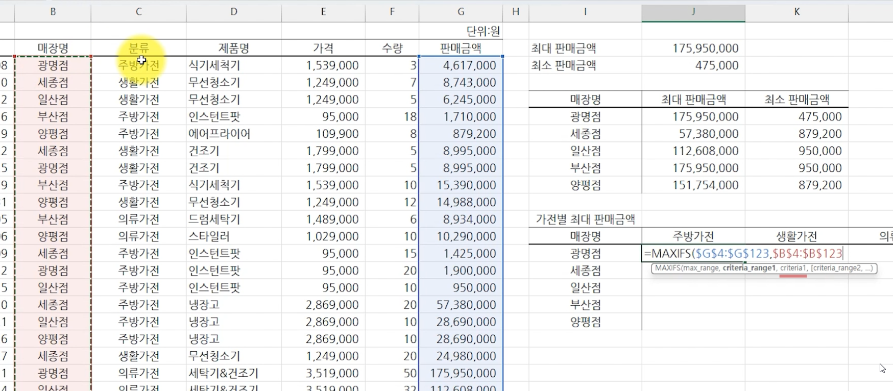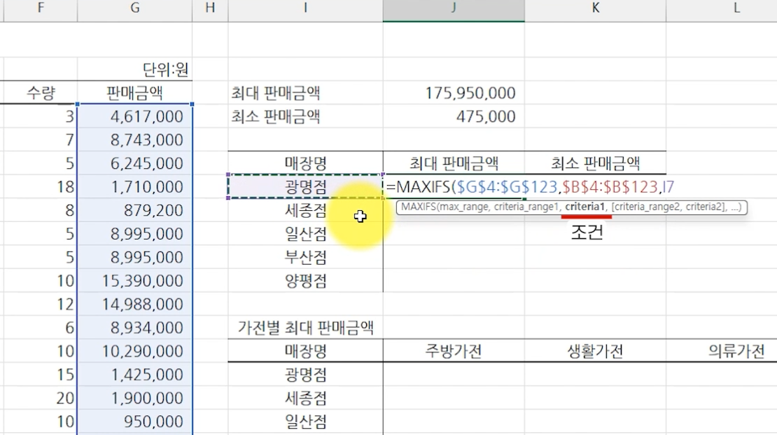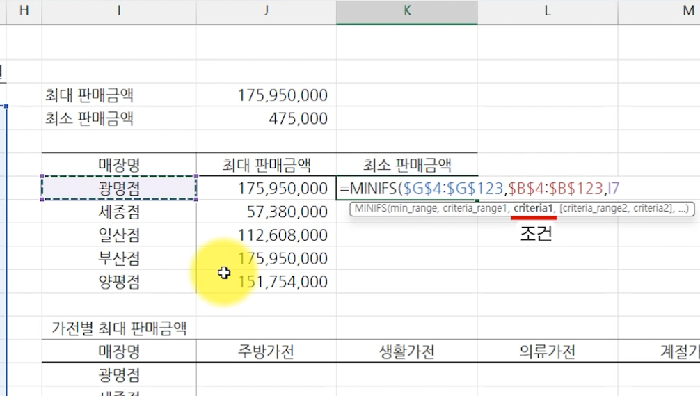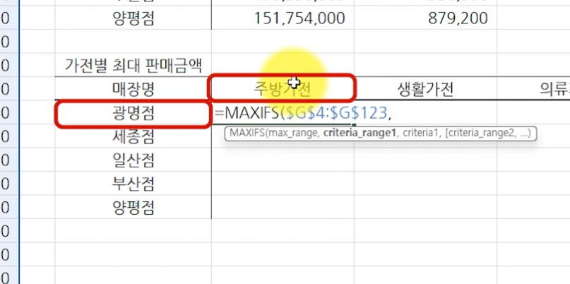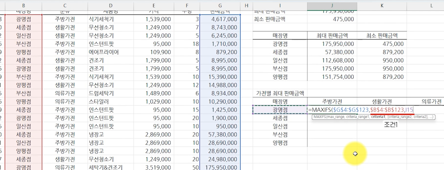 먼저 criteria_range2 인수로 가전 판매 실적에서 분류 범위를 지정하고 절대 참조합니다.