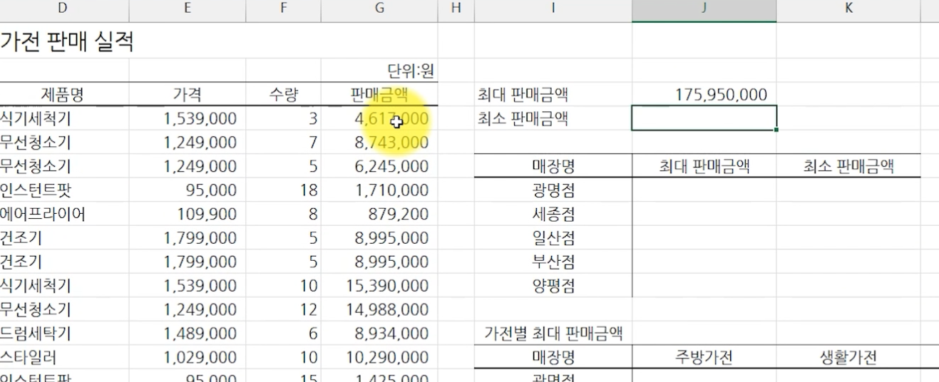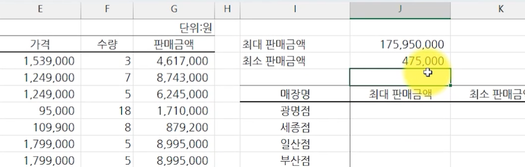 수식을 복사하면 매장별 최소 판매금액을 구했네요.