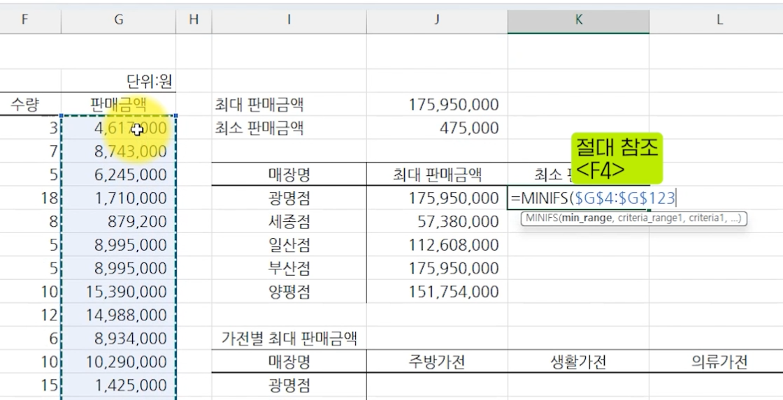 =MINIFS( 함수를 입력합니다. min_range 인수는 최소값을 구할 실제 범위에 해당하는 판매금액 범위를 지정합니다. 그리고 <F4> 키를 눌러 절대 참조합니다.