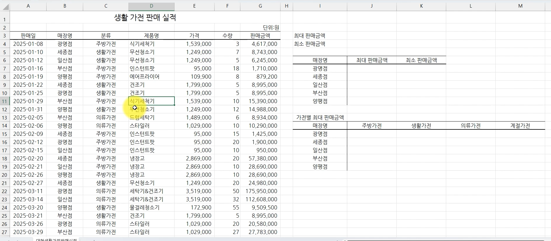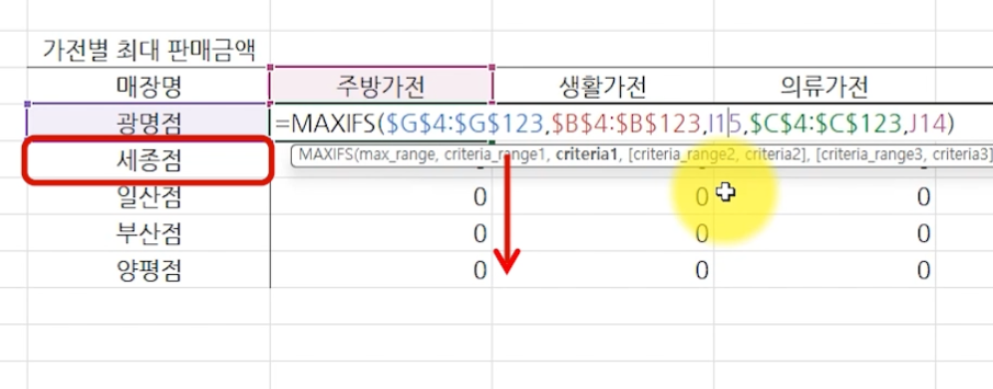 세종점을 참조해야할 셀이 변했습니다. 그리고 생활가전을 참조해야 할 셀도 변했네요.