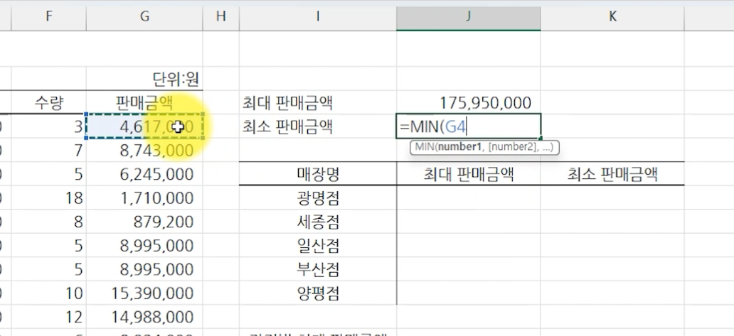 이번에는 MIN 함수를 사용해 최소값을 구해보겠습니다. 최소값을 구할 셀을 선택하고 =MIN( 함수를 입력합니다. number 인수에 판매금액 범위를 지정하고 <Enter>를 누릅니다.