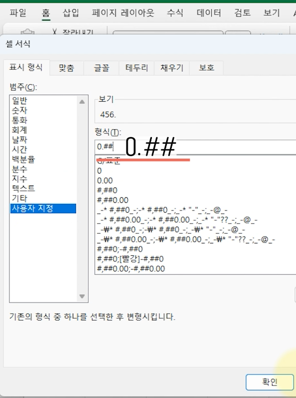 [표시 형식] 탭에서 '사용자 지정' 범주를 선택하고 형식에 0.##을 입력한 후 [확인]을 누릅니다.