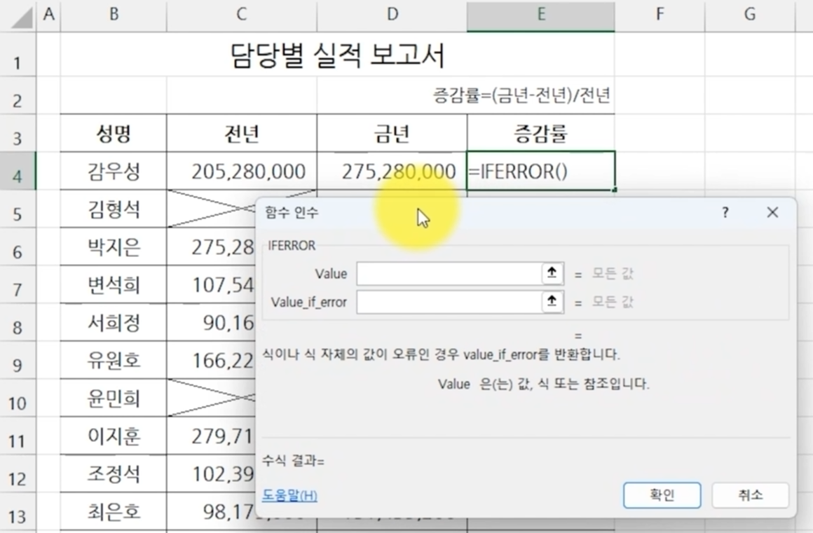 담당별 실적 보고서에서 전년 대비 증감률을 구하는 수식을 작성하면서 IFERROR 함수가 왜 사용되어야 하는지 부터 설명하겠습니다.