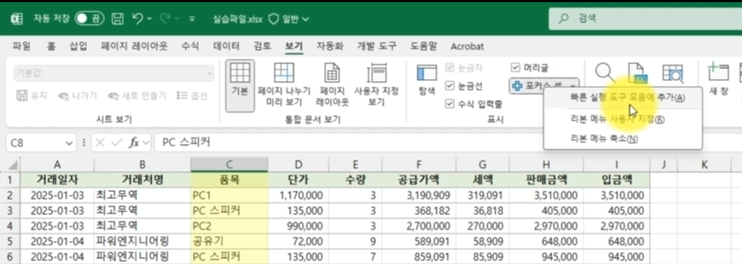 [포커스 셀]에서 마우스 오른쪽 버튼을 눌러 [빠른 실행 도구 모음에 추가]를 선택합니다.