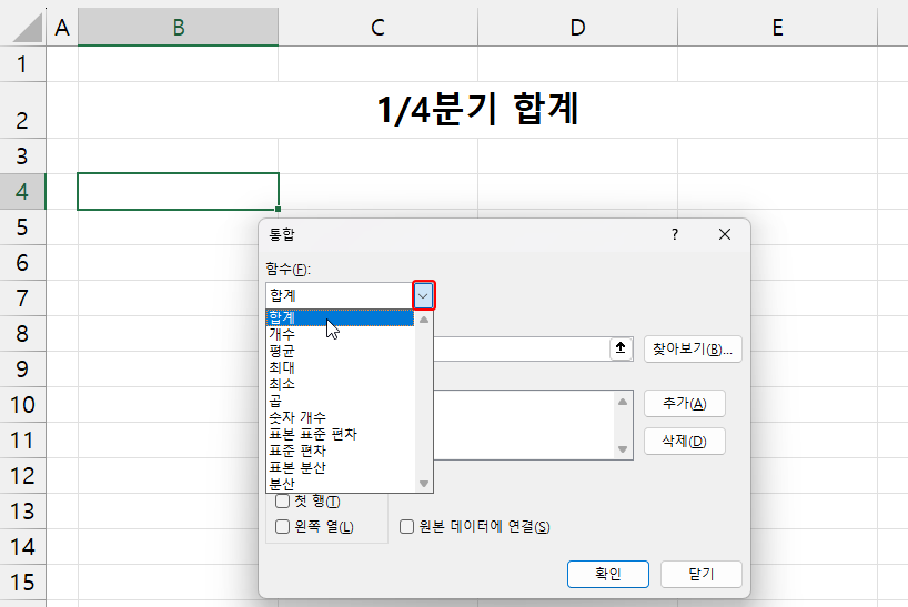 2. 합계 또는 개수, 평균 등 집계할 함수를 선택할 수 있는데, 분기별 매출 합계를 구할 것이므로 '합계'를 선택합니다.