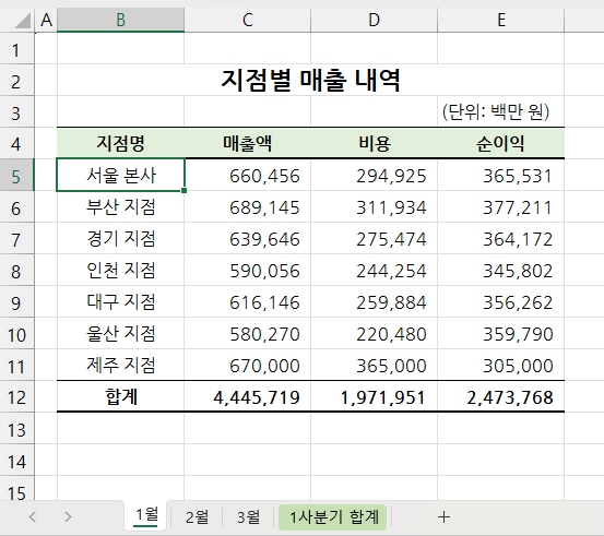 월별로 정리된 매출 내역을 분기별로 집계할 때 수식을 작성해야 한다고 생각할 수 있지만 여러 시트의 데이터를 수식으로 구하는 건 쉽지 않습니다.
