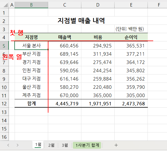 5. '첫 행'과 '왼쪽 열'에 체크 표시하고 [확인]을 누릅니다. 첫 행과 왼쪽 열에 체크 표시를 해야지 1월에서 3월 매출 내역에서 지점명은 지점명끼리, 매출액은 매출액끼리 합계를 구합니다. 이때 오타 또는 띄어쓰기가 잘못되어 있지 않아야 합니다.