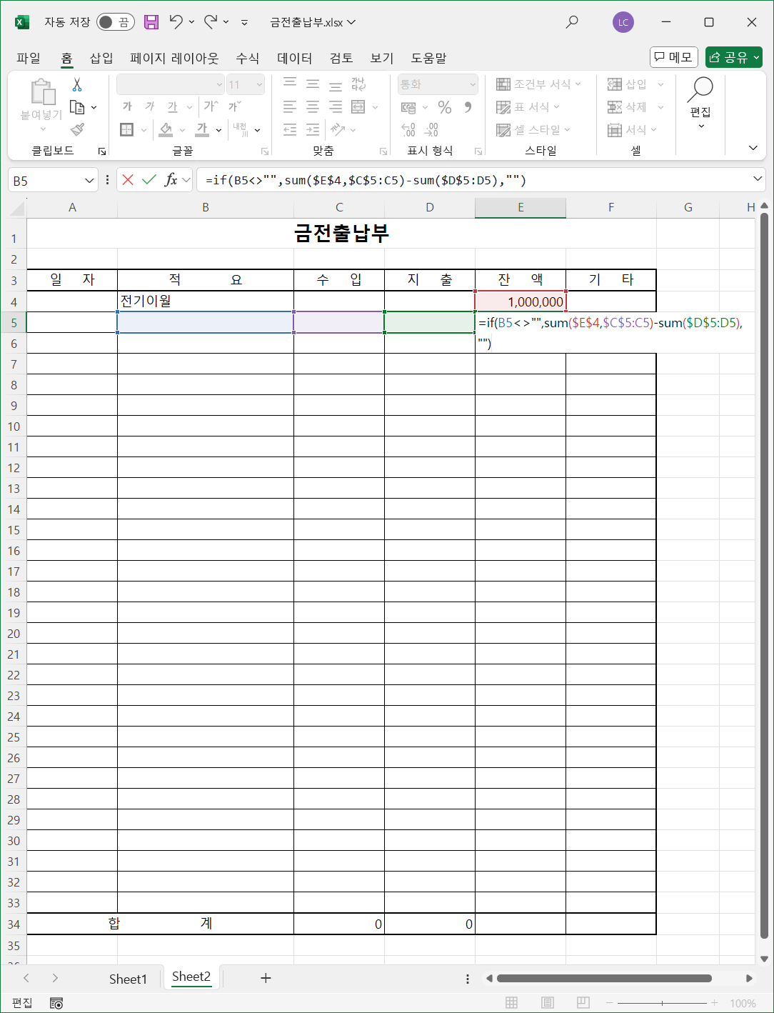 [E5] 셀 수식은 직전 잔액인 [E4] 셀에 [C5] 셀 수입을 더하고, [D4] 셀 지출을 뺀 값입니다.
