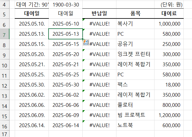 하지만 현재 대여일은 연월일 사이가 점으로 구분되어 있어 날짜가 아닌 텍스트로 인식해 계산 결과에 문제가 생기는 겁니다.