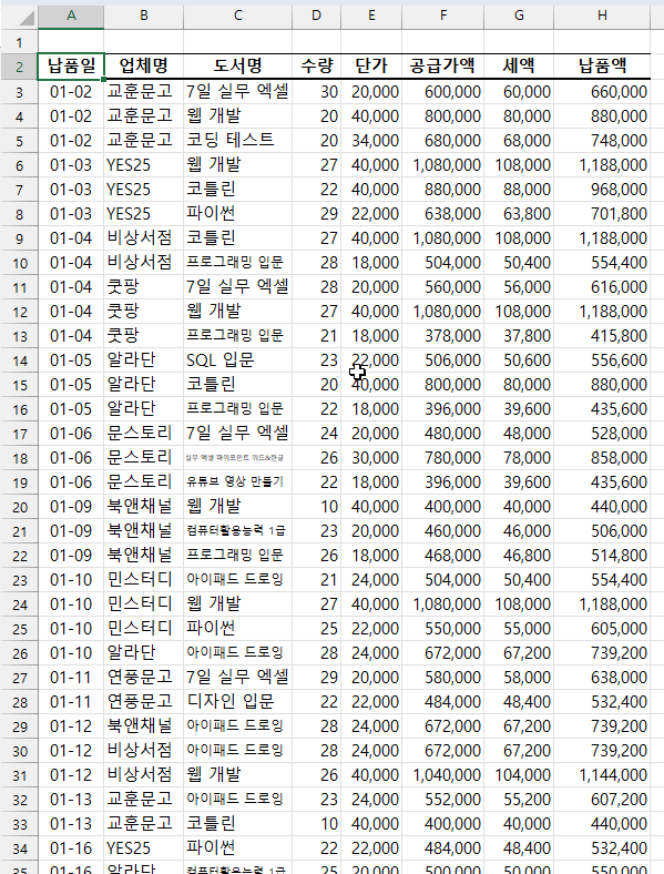 일자별 도서 납품내역을 도서별로 집계해 각 시트에 업체별 보고서를 완성하려고 합니다.
