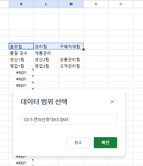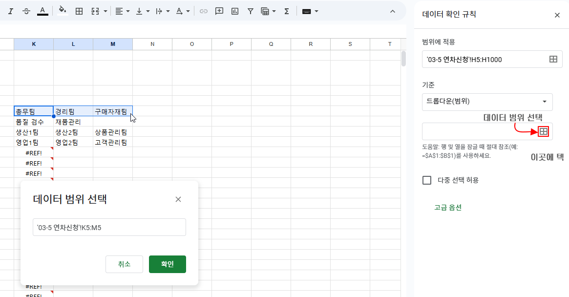 이제 연차 신청 시트를 선택하고 부서 목록을 만들어 보겠습니다. 부서 범위를 선택합니다.