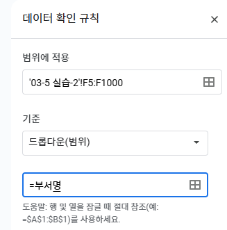 앞에서 이름으로 정해둔 부서를 호출할 것이기 때문에 기준을 '드롭다운(범위)'로 선택하고 범위 선택 영역에 '=부서'를 입력하고 <Enter>를 누릅니다.