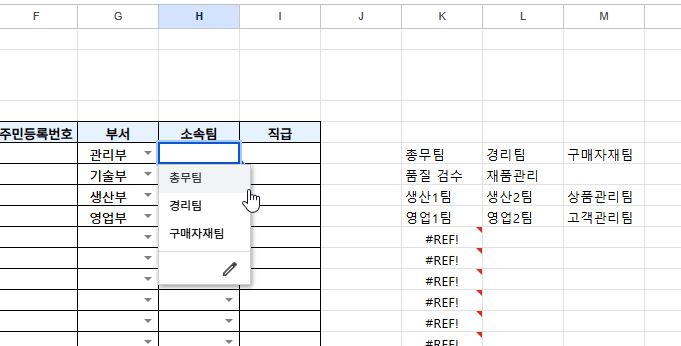 드롭다운을 눌러 부서명을 선택합니다. 셀에 부서명이 입력되죠!