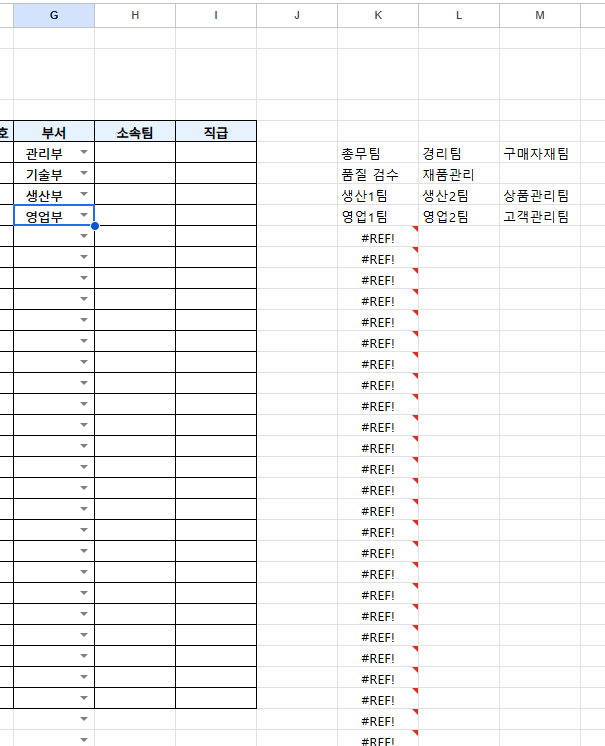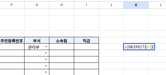 드롭다운을 추가하기 전에 [데이터 확인 규칙]에서는 함수를 사용해서 해당 값을 호출할 수 없기 때문에 임의의 셀에서 INDIRECT 함수식을 작성해 부서 드롭다운에서 선택한 부서에 맞는 소속팀을 호출하는 함수식을 작성해야 합니다.