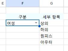 예시를 먼저 보겠습니다. 의류 구매 내역에서 여성복을 선택하면 상의, 하의, 원피스, 아우터가 표시되고