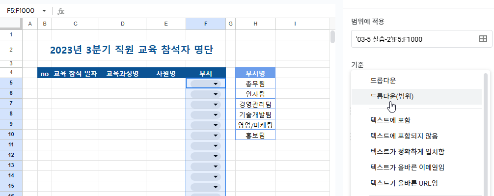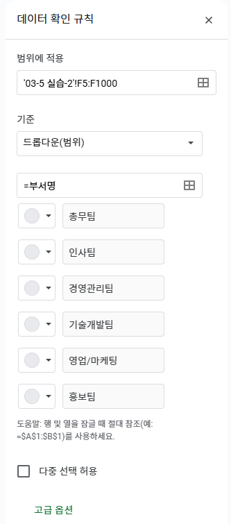 <Ctrl + Shift + ↓>를 눌러 부서 범위를 선택한 후 [데이터] - [데이터 확인]을 선택해 [규칙 추가]를 선택합니다. 기준을 '드롭다운'이 아닌 '드롭다운(범위)'를 선택합니다.