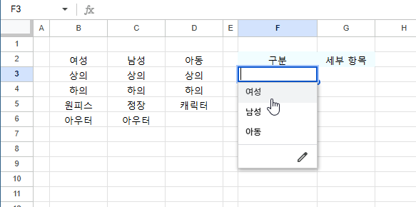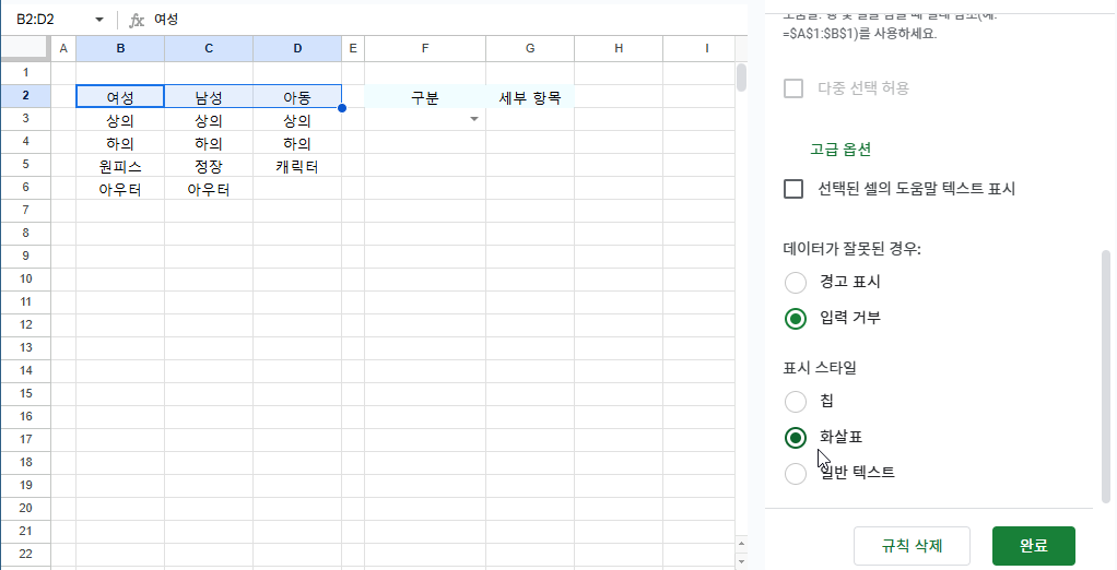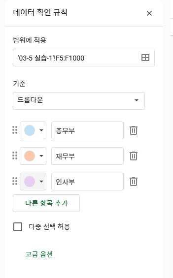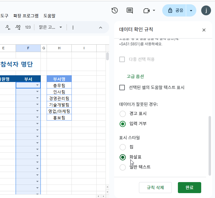 구글 스프레드시트] 엑셀 유효성 검사 목록 스프레드시트에서 사용하는 방법