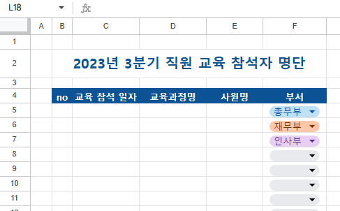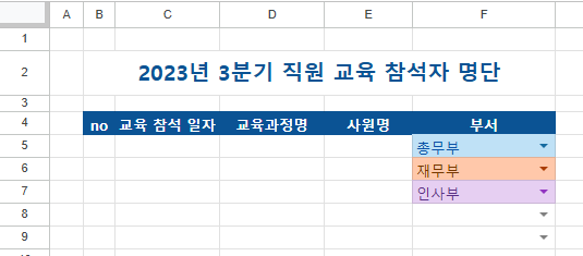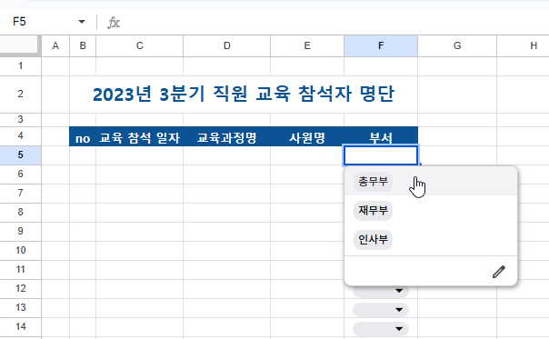 3분기 직원 교육 참석자 명단에서 부서명을 직접 입력하지 않고 드롭다운에서 선택하도록 설정해 보겠습니다. 그럼 잘못된 부서명이 입력되는 것을 방지할 수 있습니다.