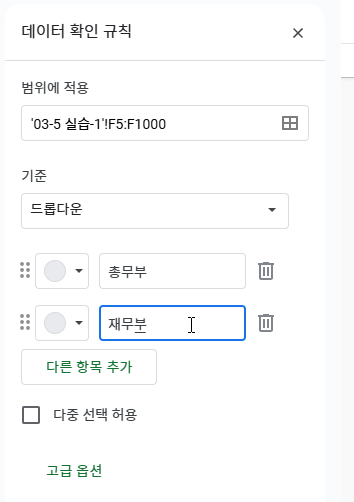 총무부, 재무부, 인사부만 입력되도록 제한하려면 직접 항목을 추가해 줘야 합니다.