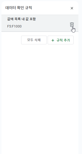 오른쪽 [데이터 확인 규칙] 창을 보면 방금 설정 내역이 표시되고 [규칙 삭제]를 눌러 설정을 제거할 수 있습니다. 그리고 규칙을 더블클릭하면 설정을 수정할 수 있습니다.
