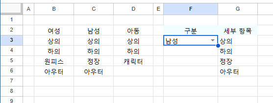 목록에서 선택한 구분에 맞는 세부 항목을 표시하려면 INDIRECT 함수를 사용하면 됩니다.