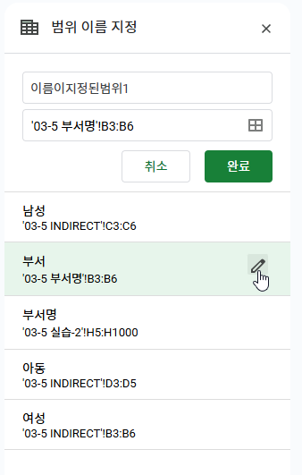 그리고 [데이터] - [이름이 지정된 범위]를 선택하고 범위 이름을 '부서명'으로 입력한 후 [완료]를 누릅니다.