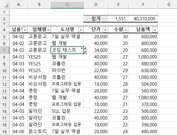 덕분에 빠르게 교훈문고의 납품액 합계를 확인할 수 있죠.