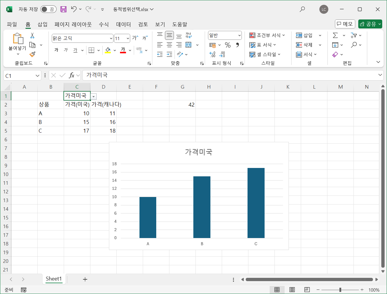 [C1] 셀 값을 바꿀 때마다 차트 데이터가 바뀌는 것을 확인합니다.
