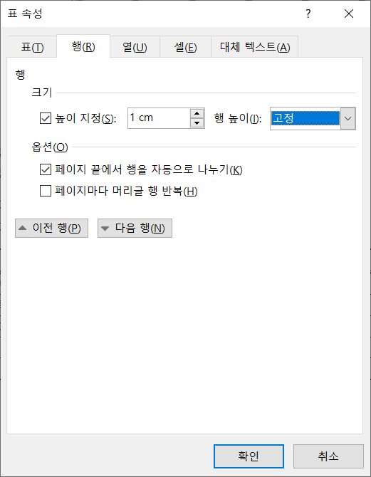 [표 속성] 대화상자 [행] 탭을 선택하고, '높이 지정'을 체크해 활성화 한 뒤 원하는 높이로 정하고, '행 높이'를 '고정'으로 바꿉니다.