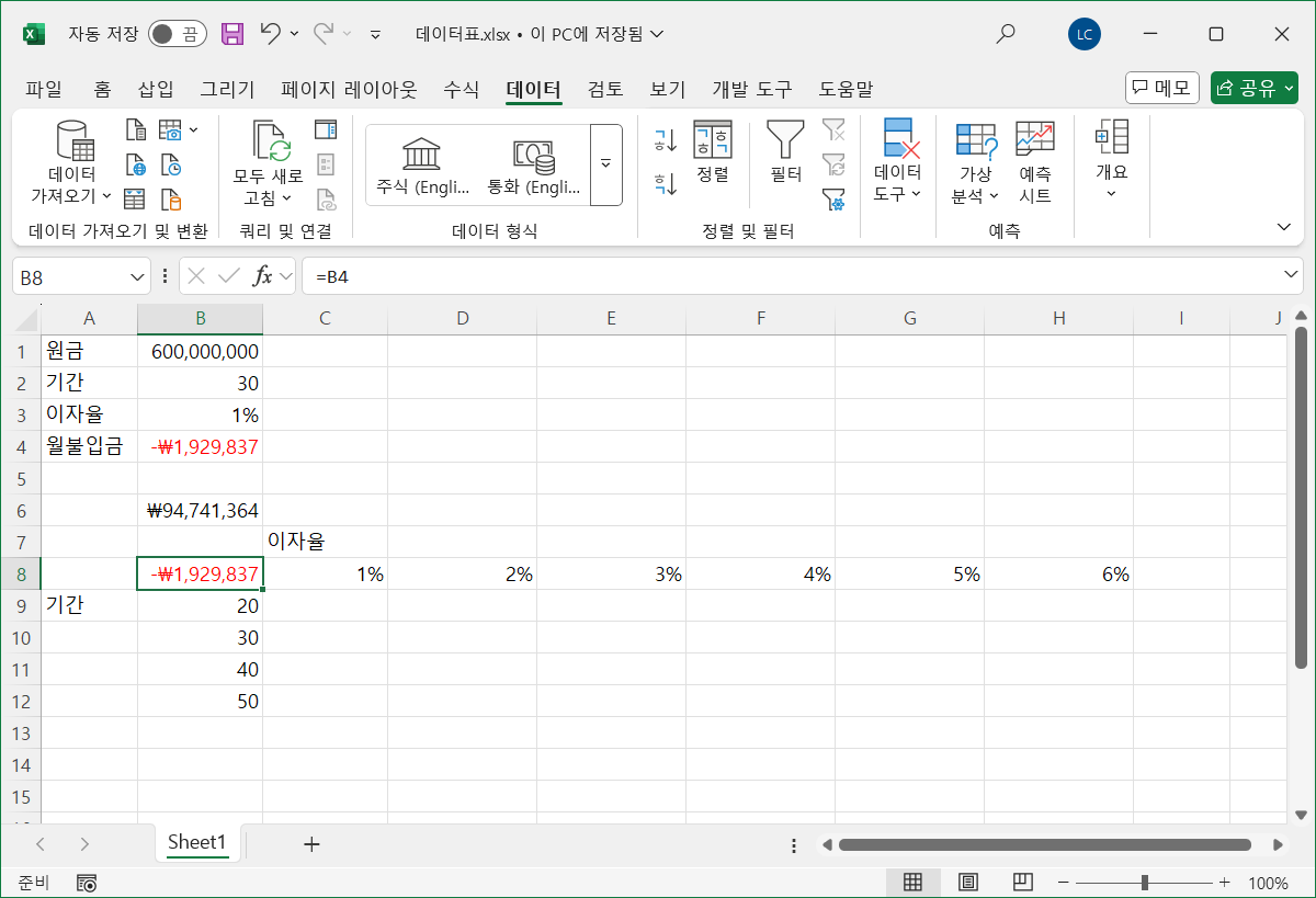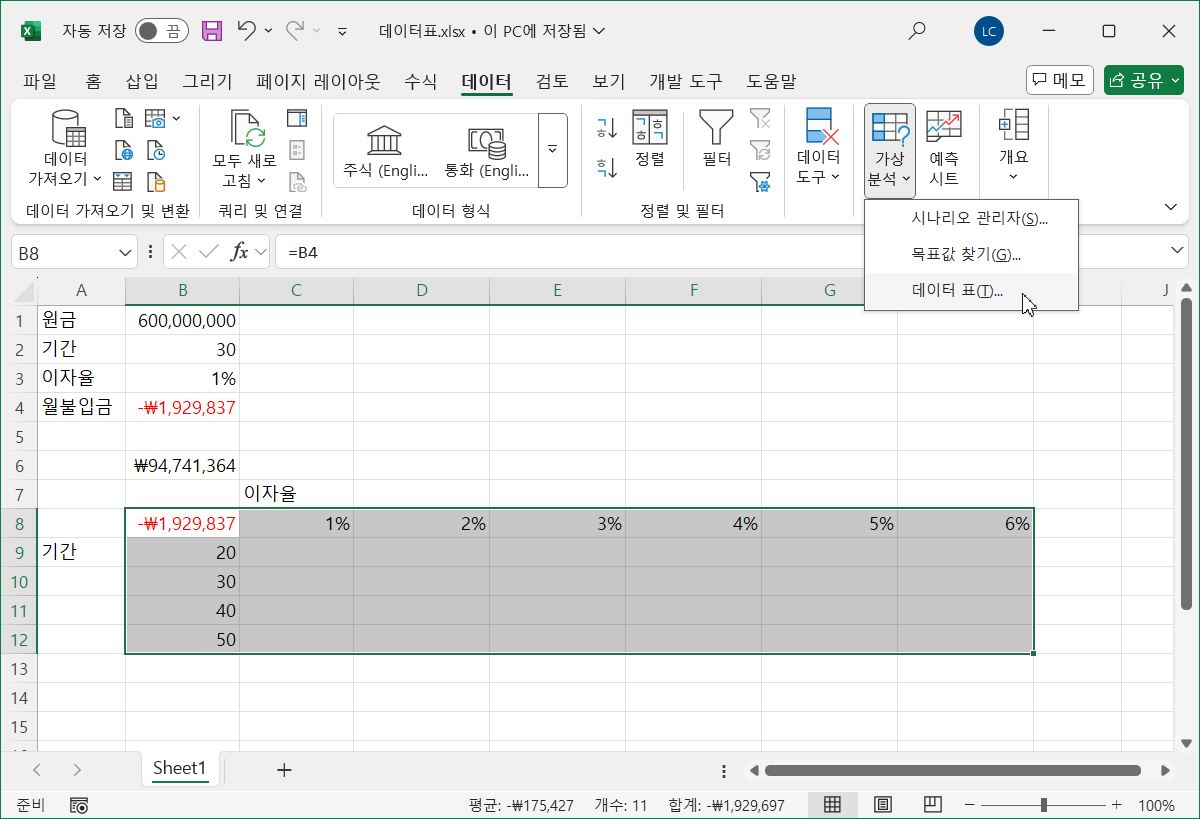 [B8:H12] 셀 범위를 선택하고, [데이터]-[예측]-[가상 분석]-[데이터 표]를 선택합니다.