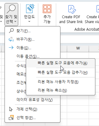 1. [홈] 탭 - [찾기 및 선택] - [이동 옵션] 메뉴에서 마우스 오른쪽 버튼을 눌러 [빠른 실행 도구 모음에 추가]를 선택합니다.