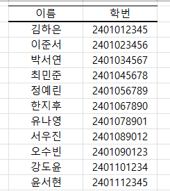 이름과 학번이 각각의 열로 깔끔하게 나누어졌습니다.