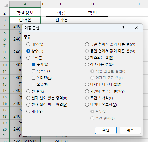 ✔️ 이 방법은 이름, 학번뿐 아니라 전화번호, 제품코드, 주소 등 텍스트와 숫자가 혼합된 데이터에 유용합니다. '상수' 대신 '수식'을 선택하면, 수식이 입력된 셀만 골라낼 수도 있습니다.