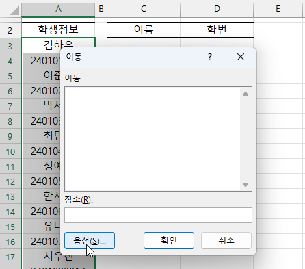1. 학생정보 범위를 드래그하여 선택한 후 단축키 <F5>를 눌러 [이동] 대화상자가 실행되면 [옵션]을 클릭합니다.