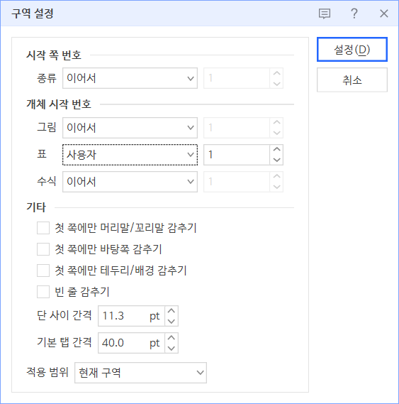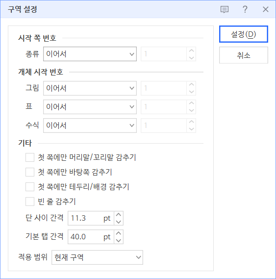 [쪽]-[구역 설정]을 누르거나 단축키 <Ctrl + N,G>를 눌러 [구역 설정] 대화상자를 표시합니다.
