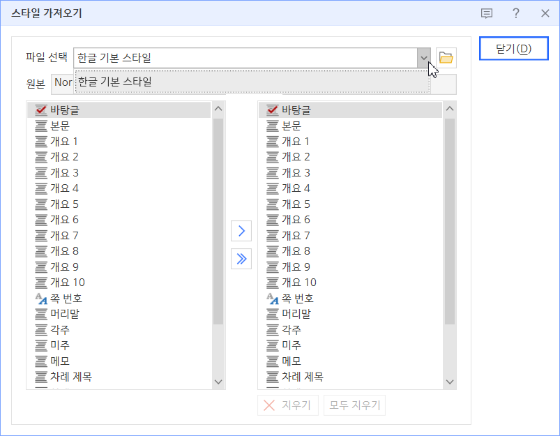 어떤 이유로든 기본 스타일이 지워진 경우엔 사용자가 직접 기본 서식 파일인 normal.hwt에서 스타일을 가져올 수 있습니다.